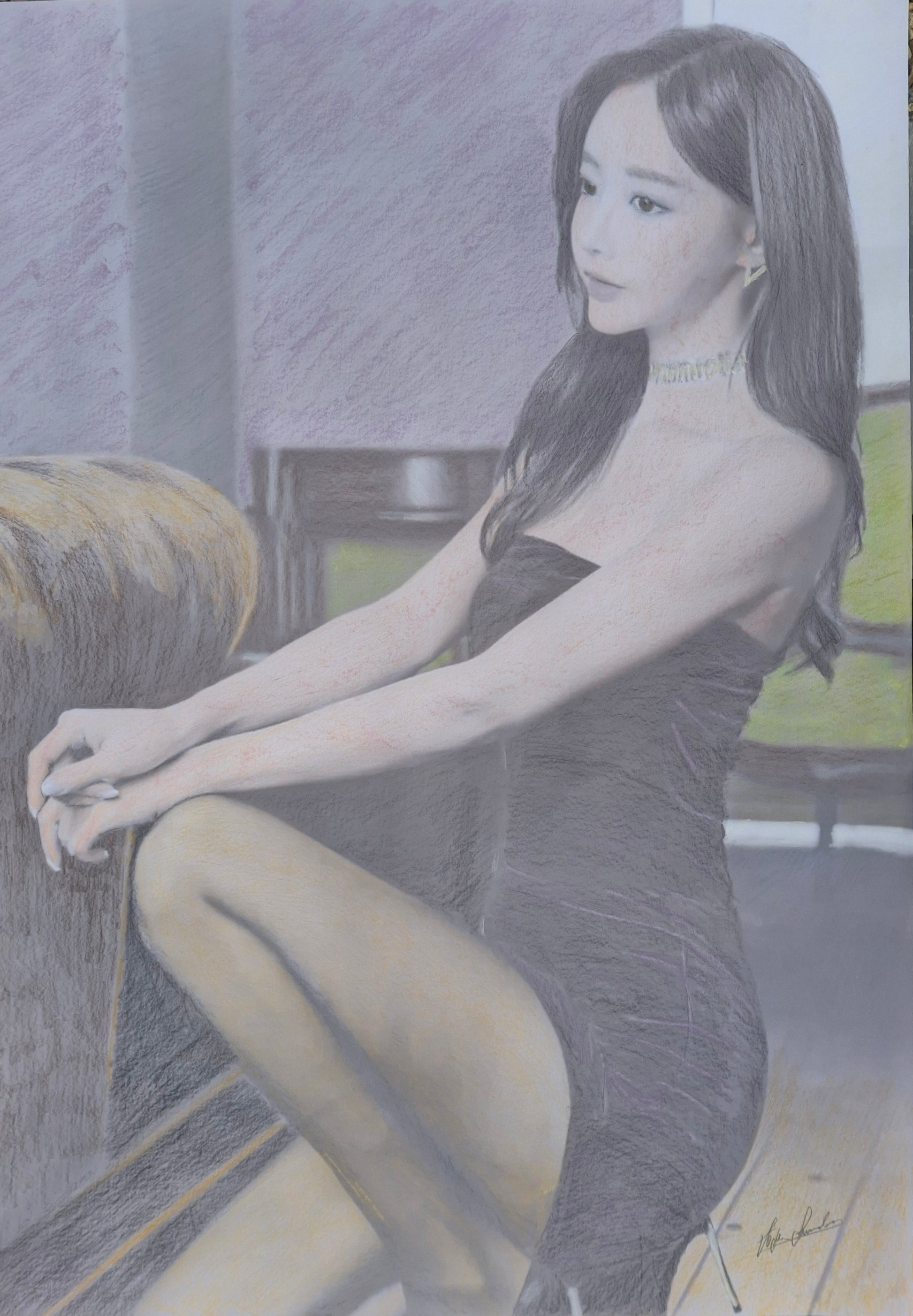Large (A0) study of Japanese model Ai-Ri. Soft graphite pencil, dry watercolour pencils and chalk over dilute ink on paper.