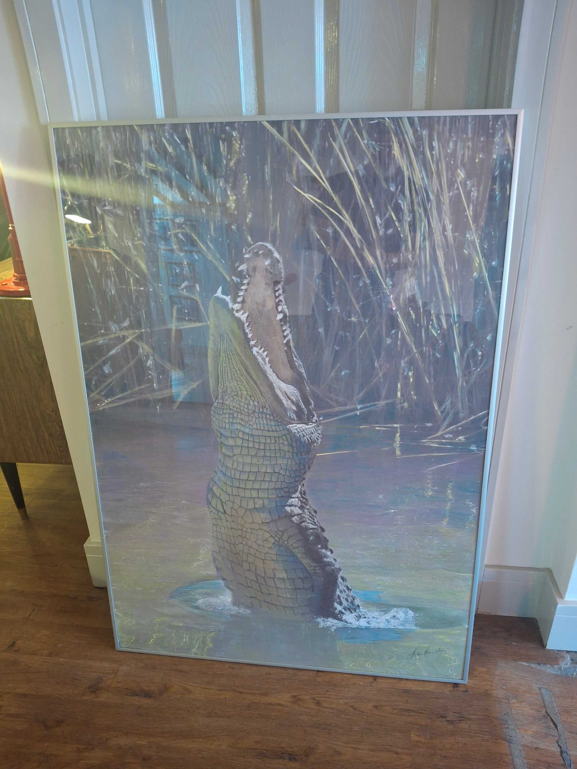 Large (A0) size drawing, portrait of a crocodile in soft graphite (9b) pencil, dry watercolour pencils, ink and chalk on paper. Part of a series of large wildlife drawings. Signed original.