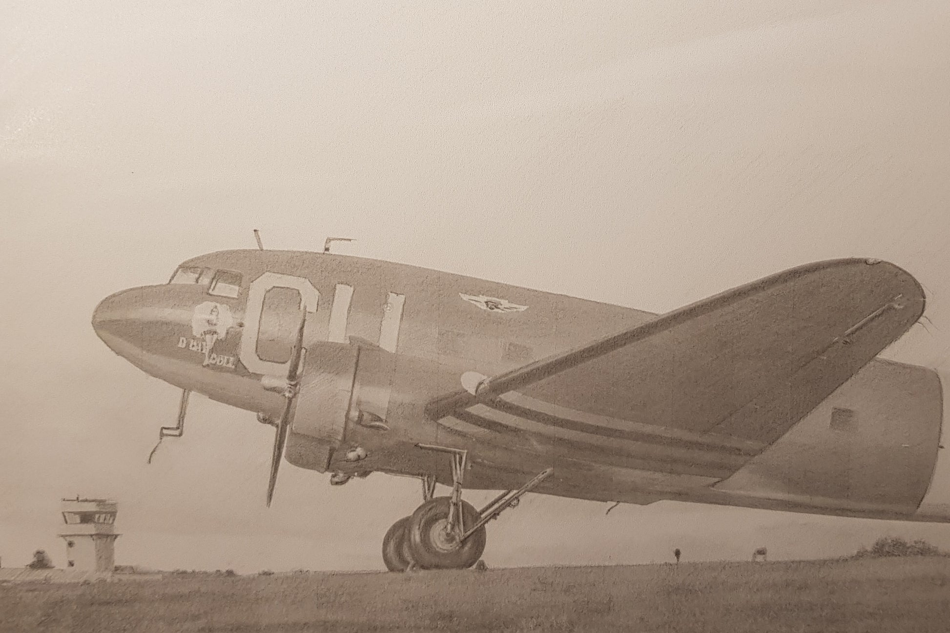 A small soft graphite pencil sketch of a Douglas Dakota DC3 parked on the tarmac.