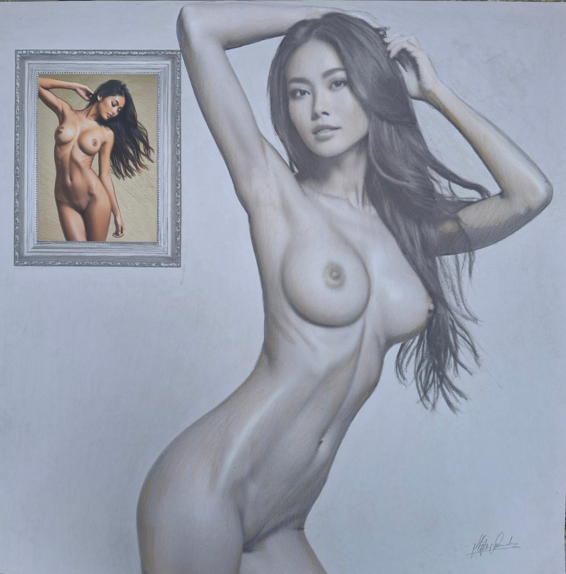 SOLD Large drawing in soft graphite pencil, coloured pencils, dilute ink and chalk on paper. It is approximately 840mm x 840 mm.