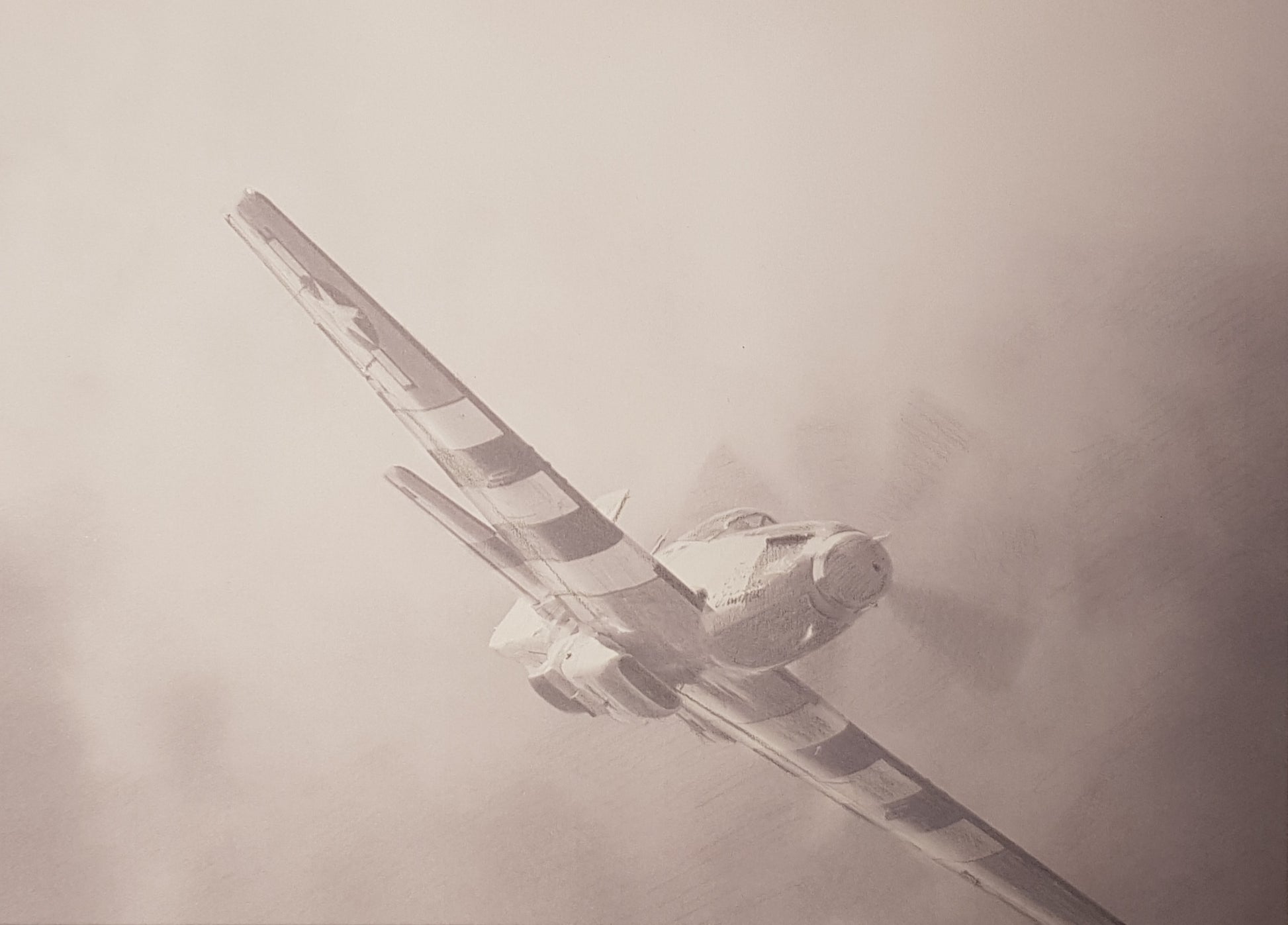 A3 graphite and dry white watercolour pencil sketch of Mustang fighter from WW2. Signed original; £199,