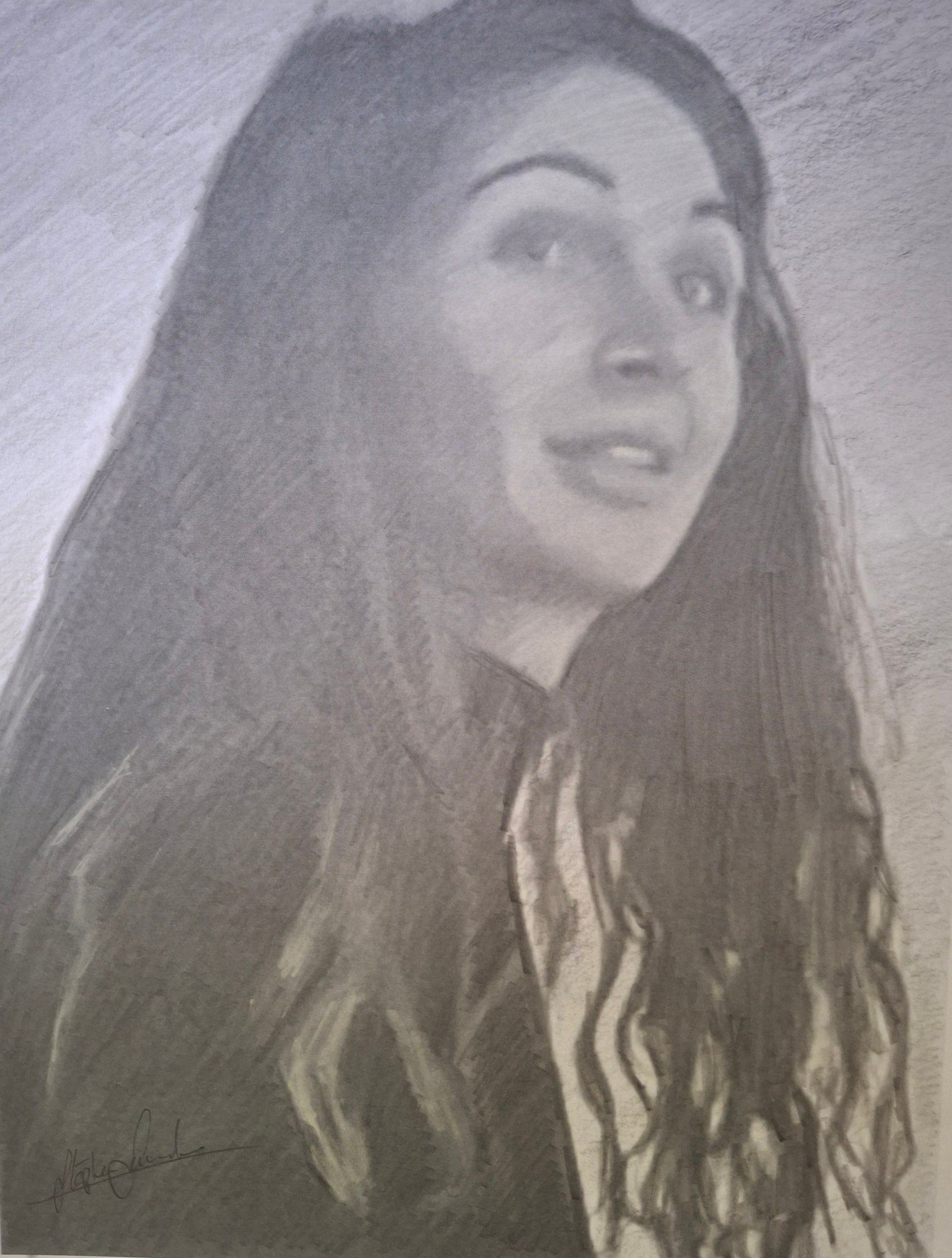 Pencil sketch of a woman. Drawn from my own photograph of her.