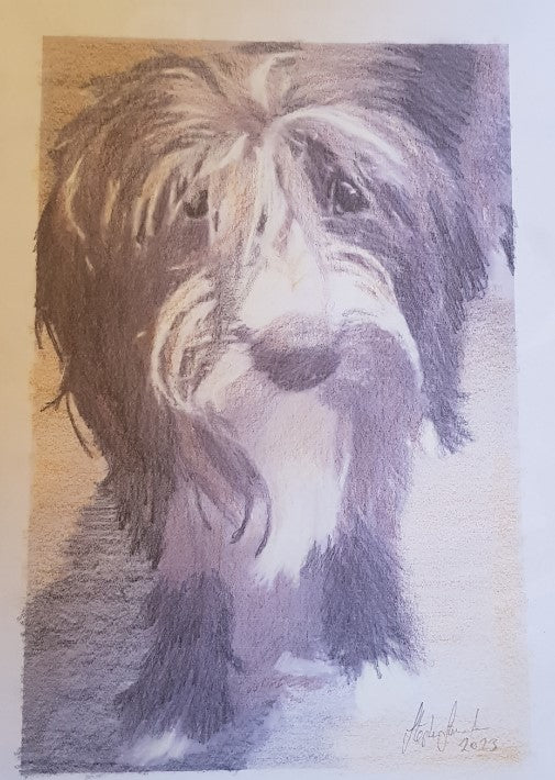 Commissioned graphite and watercolour pencil (dry) portrait of a customer’s dog. This is now a greetings card (A5). Available individually at £3.50, but the intention here is to offer it to retailers. If you have a card or gift shop and would like to order a box of fifty, buy here (by emailing me) at £1.50 per card. Most of the images you see here are reproduced as A5 cards and come with envelope and cellophane sleeve. You can mix and match a box of fifty as you wish. email me articusdrawings@gmail.com