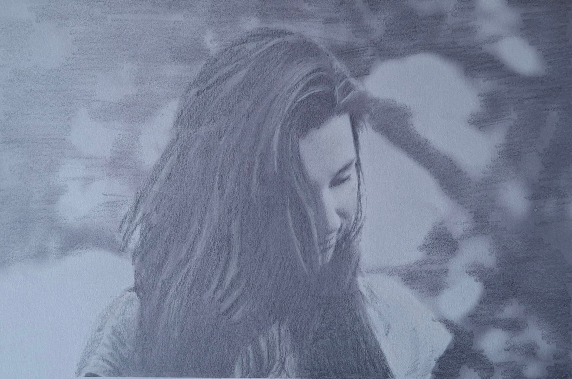 Small soft graphite pencil and dry white watercolour pencil sketch of a shy woman.