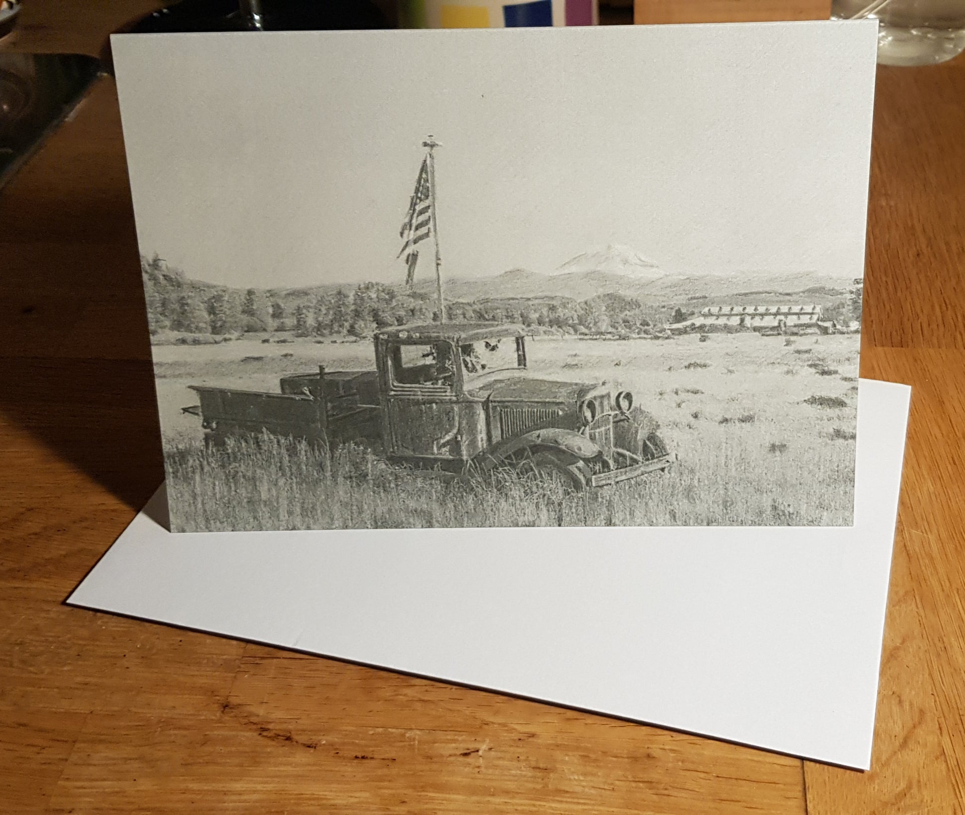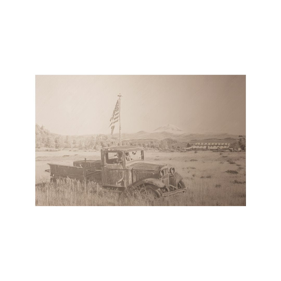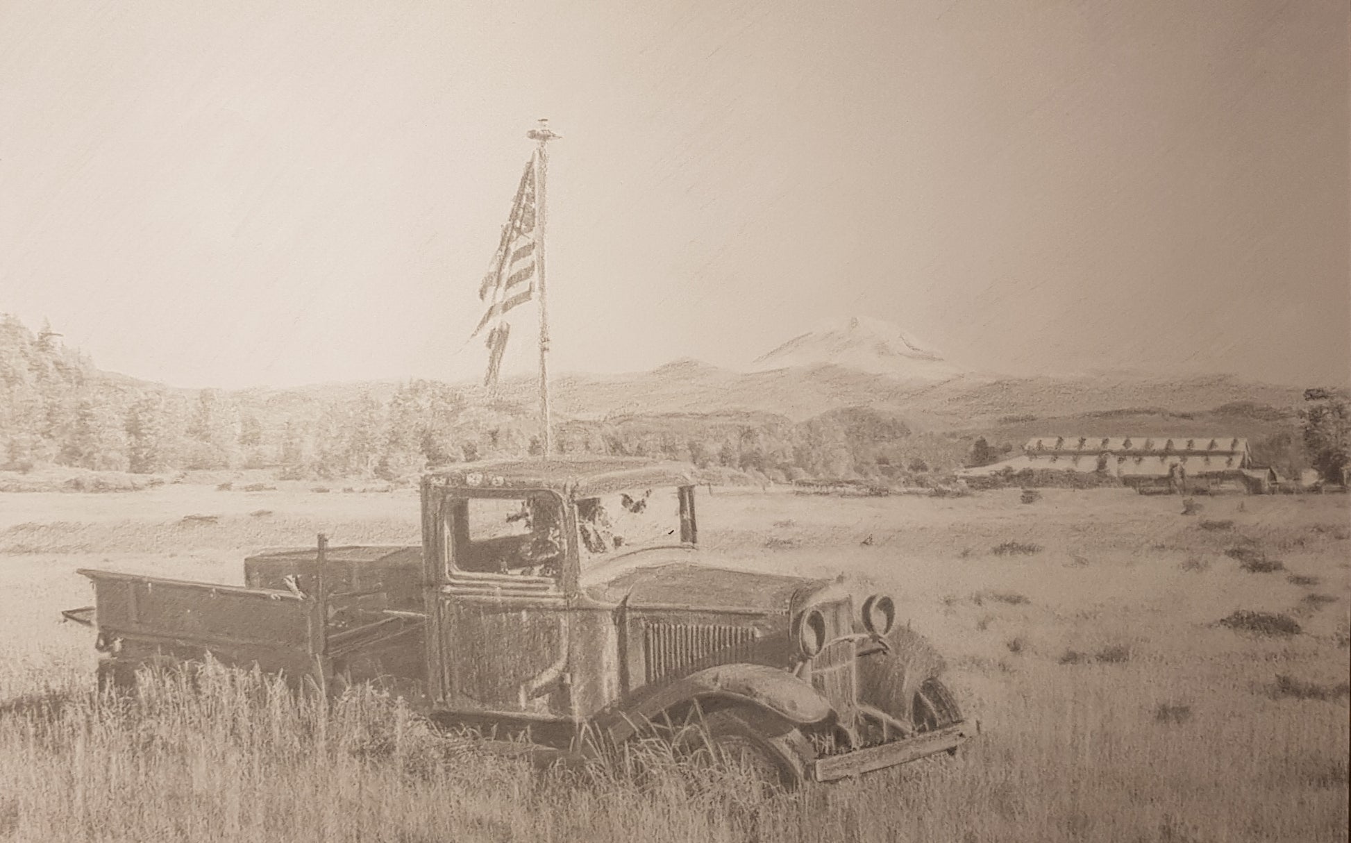 Old abandoned truck in a field with an adjacent flagpole and a tattered United States flag.