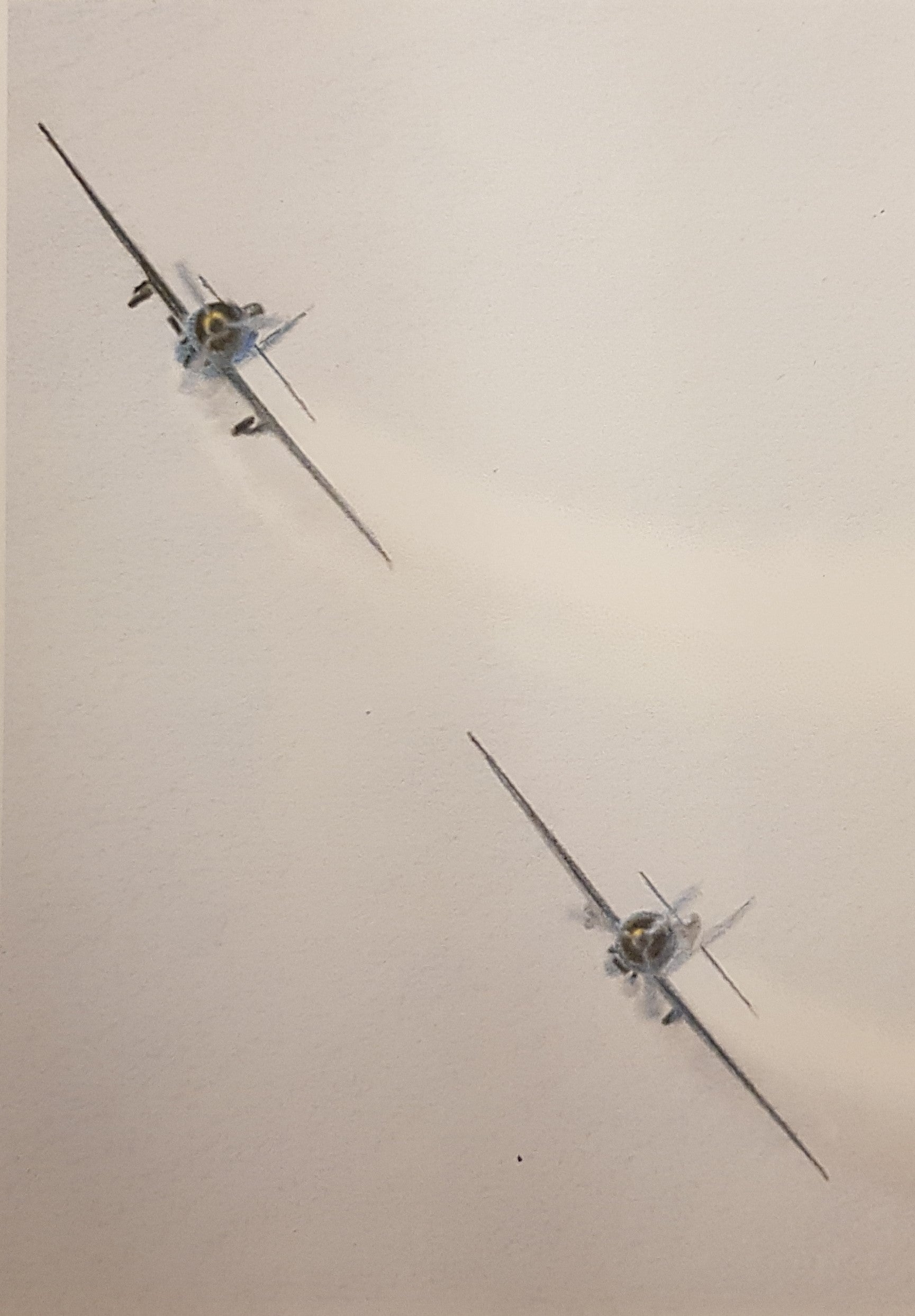 A soft graphite pencil, dilute ink and coloured pencil and chalk sketch of two fighter planes in formation. On A4 paper.